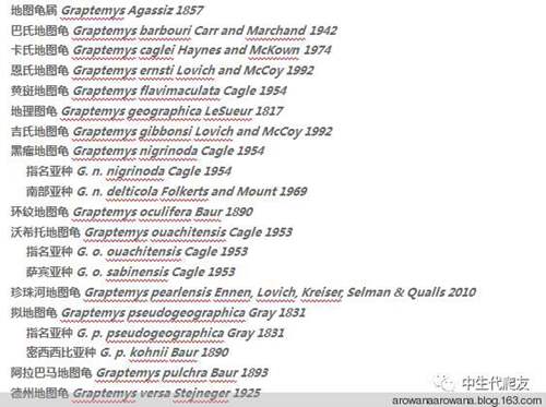地图龟的种类繁多,按照现行的分类,一共有13个种。其中,拟地图龟、沃希托地图龟、黑瘤地图龟都有亚种存在。地图龟的种类如下图所示。具体的一些俗名在介绍种类的时候写出来。地图龟的各个种类或亚种可以通过头纹和甲壳的一些细节进行区分,区别还是比较明显的,另外在分类上也不太复杂。