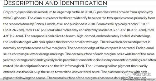 既然说到分类,简单的说一下。我们常说的拟地图龟和密西西比地图龟隶属于同一个种(拟地图龟),密西西比地图属于拟地图的一个亚种。此外,地图龟在2010年发现的珍珠河地图龟原本隶属于吉氏地图龟。具体情况是这样的,在2010年,珍珠河地图龟被取消在隶属于吉氏地图龟的分类地位,在Ennen Lovich等人研究出版的资料中,按照形态分类的方式将珍珠河地图龟和吉氏地图龟区别,下文会提到二者区别~