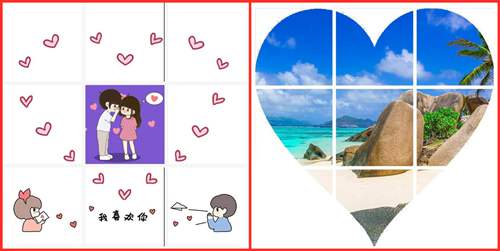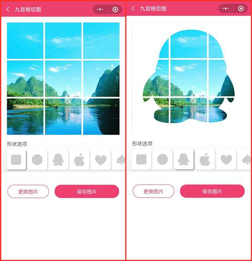 比如我们现在用一张风景图来做为朋友圈封面,我们就可以选择第一个功能九宫格切图,我们点击更换图片按钮,选择本地我们拍的风景图,然后选择形状选项,系统提供了方形、圆形、心形等多种形状的图形。我们选择自己喜欢的形状后,点击保存图片就行。软件会把一张风景图切割成九个小图片保存在手机相册里面,我们发朋友圈的时候依次上传九张图片就行了。