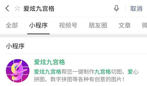 首先选择一个九宫格图片制作的小程序,这里推荐大家使用“爱炫九宫格”,大家可以在微信小程序里面搜索“爱炫九宫格”找到这个九宫格做图软件。