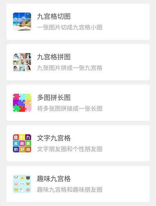 打开这个软件我们会看到有五大模块:1、九宫格切图:一张图片切成九宫格小图;2、九宫格拼图:九张图片拼成一张九宫格;3、多图拼长图:将多张图拼接成一张长图;4、文字九宫格:文字朋友圈和个性朋友圈;5、趣味九宫格:趣味九宫格和趣味朋友圈