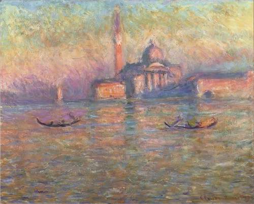 说到色彩那就必须要特别说说这副《黄昏的圣乔治·马焦雷岛》了,虽然比起莫奈的其他画作《干草堆》或《睡莲》,没有那么高的艺术价值,但它绝对是莫奈在威尼斯之行中始创作的画之中让人印象最为深刻的。这幅画的主题表面上是描绘圣乔治·马焦雷岛,但画中的内容都是为了捕捉日落时的光线之美,完美的传达了光线的变化和水中可见的流动。莫奈用细密可见的笔触,将纯色并置混合,营造出一种运动感。红、橙、紫、黄等轻盈的笔触相互交错使天空以及流动的水中的反射显得变幻莫测。与夕阳的暖色形成鲜明对比的是,建筑物的轮廓用深蓝色、紫色和紫罗兰色绘制。值得注意的是,即使是阴影和轮廓也是由颜色组成的,因为莫奈在1886年之后就不再使用黑色颜料了,而且他也会避开棕色和土色。