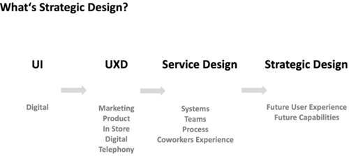提到Strategy Design大家可能也会联想到其它一些相关专业,比如:User Interface(UI),User Experience Design(UXD),Service Design。首先,我对它们做一个简单的区分。其实有很多不同的方法和角度去解释和分辨,因为它们之间有很多的相同点,今天我提到的是其中一个角度供大家参考,看能否从这个角度理解它们之间的关系。