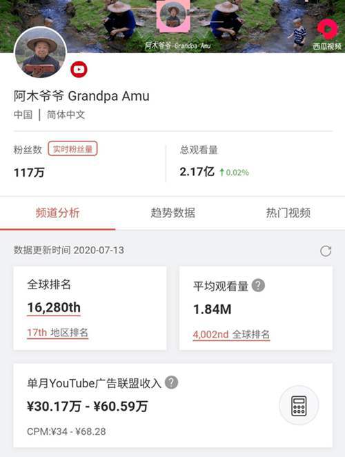 阿木爷爷光是在油管上的流量分成一个月就有30-60万人民币,而这仅仅是一个平台的流量分成。也不包含他手艺活上赚的钱。