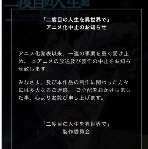 日本《朝日新闻》6月6日报道称,原作小说确认将停止出版,原定于今秋问世的动画版也遭遇4位主要声优(配音演员)“集体辞演”,该作品动画制作委员会也在官网宣布中止动画版制作。如图1: