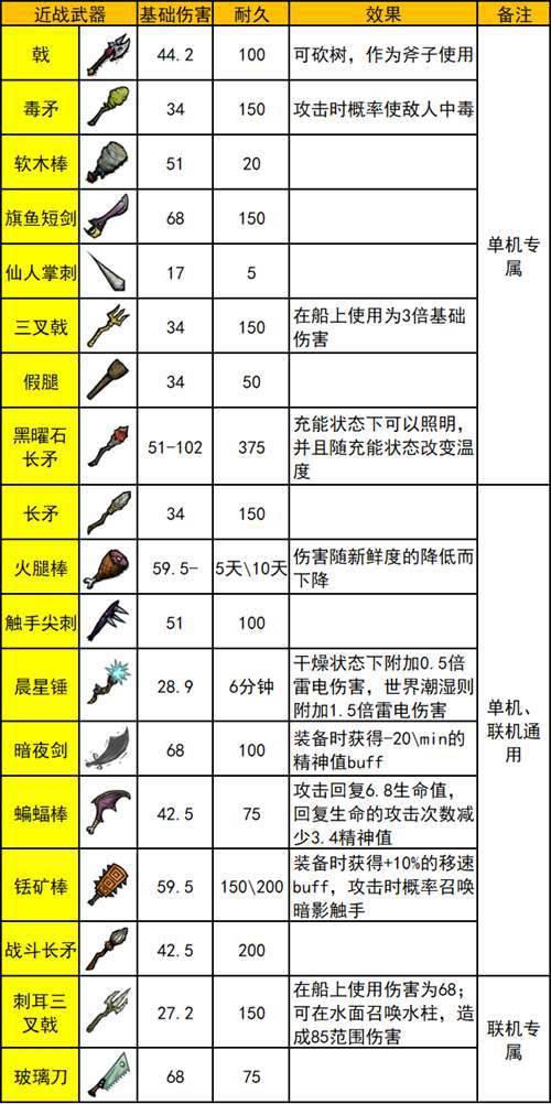 本条目包括:戟、毒矛、软木棒、旗鱼短剑、仙人掌刺、三叉戟、假腿、黑曜石长矛、长矛、火腿棒、触手尖刺、晨星锤、暗夜剑、蝙蝠棒、铥矿棒、战斗长矛、刺耳三叉戟、玻璃刀。