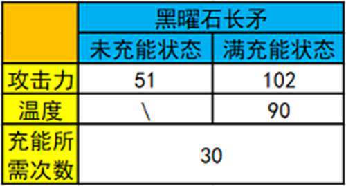 黑曜石长矛达到满充能状态需要攻击30次,攻击力从51提高到102,每次攻击将会提高1.7攻击力。