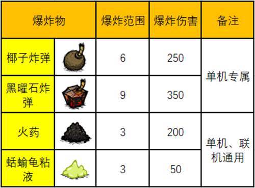 ②爆炸物,爆炸物包括炸弹、火药、蛞蝓龟粘液在内,不受伤害系数影响。
