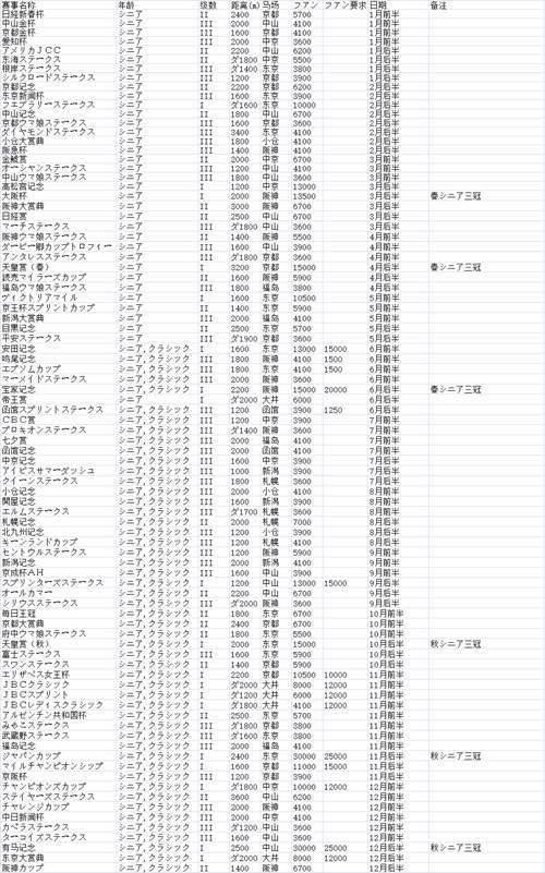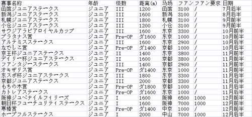 现实赛事名称含有「牝马」字眼以「ウマ娘」代替;「2岁」字眼以「ジュニア」代替
