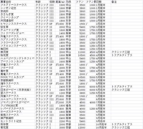 注意部份赛事有限制年龄参加,错过赛事或落败就只有下次育成再参赛。另外注意因限随现实赛事令路程及场地分布非常「不公」,高ファン集中在中长距离,泥地则较少高ファン数的比赛。