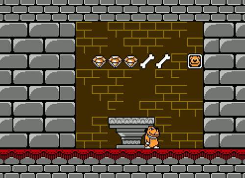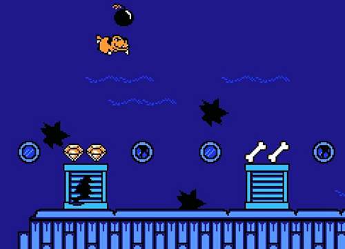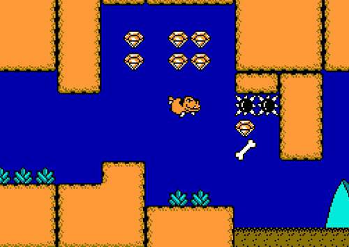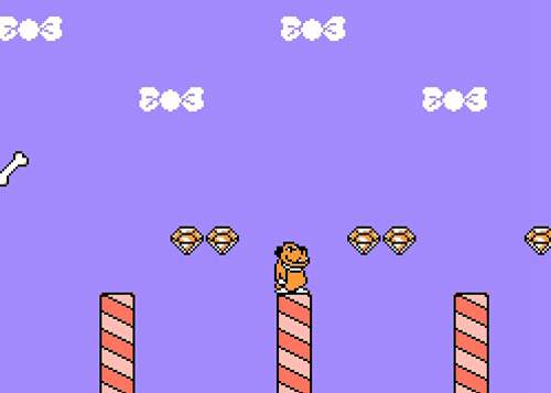 游戏画面:左,上面是钻石(吃够99个加1命数),下面是命数。中间是调度栏,每吃一根骨头就能让调度栏向右一个位置(调度栏依次是炸弹,气波,滑翔,血量),右侧是生命和时间(每小关给3分钟时间,3分钟足够了)