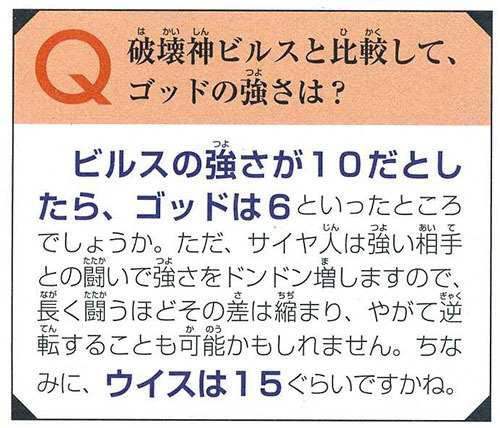 而鸟山明在“《龙珠Z:神与神》彩漫的神级访谈”中提到,以量级来计算实力:若把破坏神比鲁斯看作10的话,那超级赛亚人之神大概是6,而维斯约为15。同时,由于悟空已经吸收了超赛神的力量,所以没有必要再变身成超赛神了。至于其他赛亚人,也有变成超赛神的可能,不过战斗力强弱会因人而异。