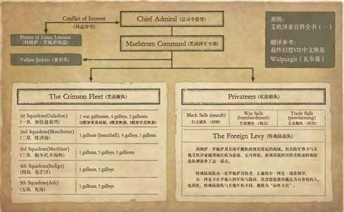 另一方面,私掠船队是辅助于黑涡团的军队势力,包含听命于提督的私人船队、被征用的武装商船,以及整装一新的退役船只。最后,特殊陆战队也是私掠船队的一部分,由不计其数的,陆战经验丰富的冒险者小队组成,填补了利姆萨自古以来的空缺。