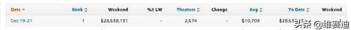果不其然,影片上映的上映的第一个周末,是北美的圣诞档(相当于中国的春节,非常好的档期)成绩却仅仅2800多万美元。