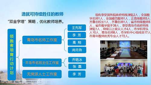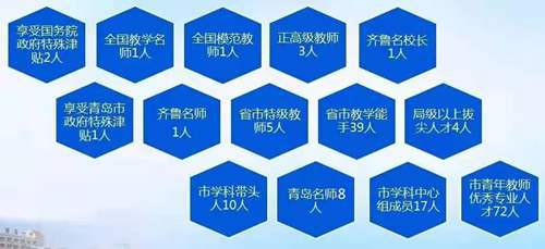 学校实施人才强校战略,打造了一支业务精湛、敬业乐教的教师队伍。现有享受国务院政府特殊津贴2人,全国教学名师1人,全国模范教师1人,正高级教师3人,齐鲁名校长1人,齐鲁名师1人,省市特级教师5人,省市教学能手39人,享受青岛市政府特殊津贴1人,局级以上拔尖人才4人,市学科带头人10人,青岛名师8人,市学科中心组成员17人,市青年教师优秀专业人才72人。拥有多个青岛市“名师工作室“和”名班主任工作室”,引领教师专业成长;实施双“金字塔策略”、“领跑者培育行动计划”,加强教师队伍梯队建设。