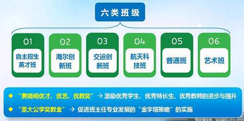 根据学生发展需要,现有的教学班分为自主招生“英才班”、海尔创新班、交运创新班、航天科技班、普通班和艺术班。设立“黄晓明优才、优艺、优教奖”,激励了优秀学生、优秀特长生、优秀教师的进步与提升;“圣大公学奖教金”,促进了班主任专业发展的“金字塔策略”的实施。