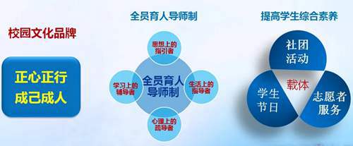 学校融合传统文化与时代特色,形成了以“正成”为基因的“正心正行,成己成人”的校园文化品牌。以“立德树人、提升内涵”为抓手,构建以学校“四自”与班级“六自”相结合的德育工作模式,实行“全员育人导师制”。以学生节日、社团活动和志愿者服务为载体,提高学生综合素养,艺术、体育教育成果丰硕。